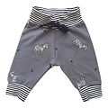 Grijs broekje met zebra's en zwarte driehoekjes. De boordjes zijn van zwart wit gestreepte stof. Het broekje is elastisch, zodat je baby zich lekker kan bewegen.
