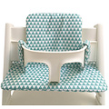 Dit prachtige stoelkussen is gemaakt van gelamineerde stof en past op de Stokke tripp trapp. Het stoelkussen is afneembaar. De stof heeft een patroon van mint en witte driehoeken.
