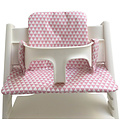 Stoelkussen met roze en witte driehoeken print, geschikt voor de Stokke tripp trapp. Dit stoelkussen is gemaakt van gelamineerde stof, waardoor het makkelijk is af te nemen. Lees voor onderhoudstips even verder!